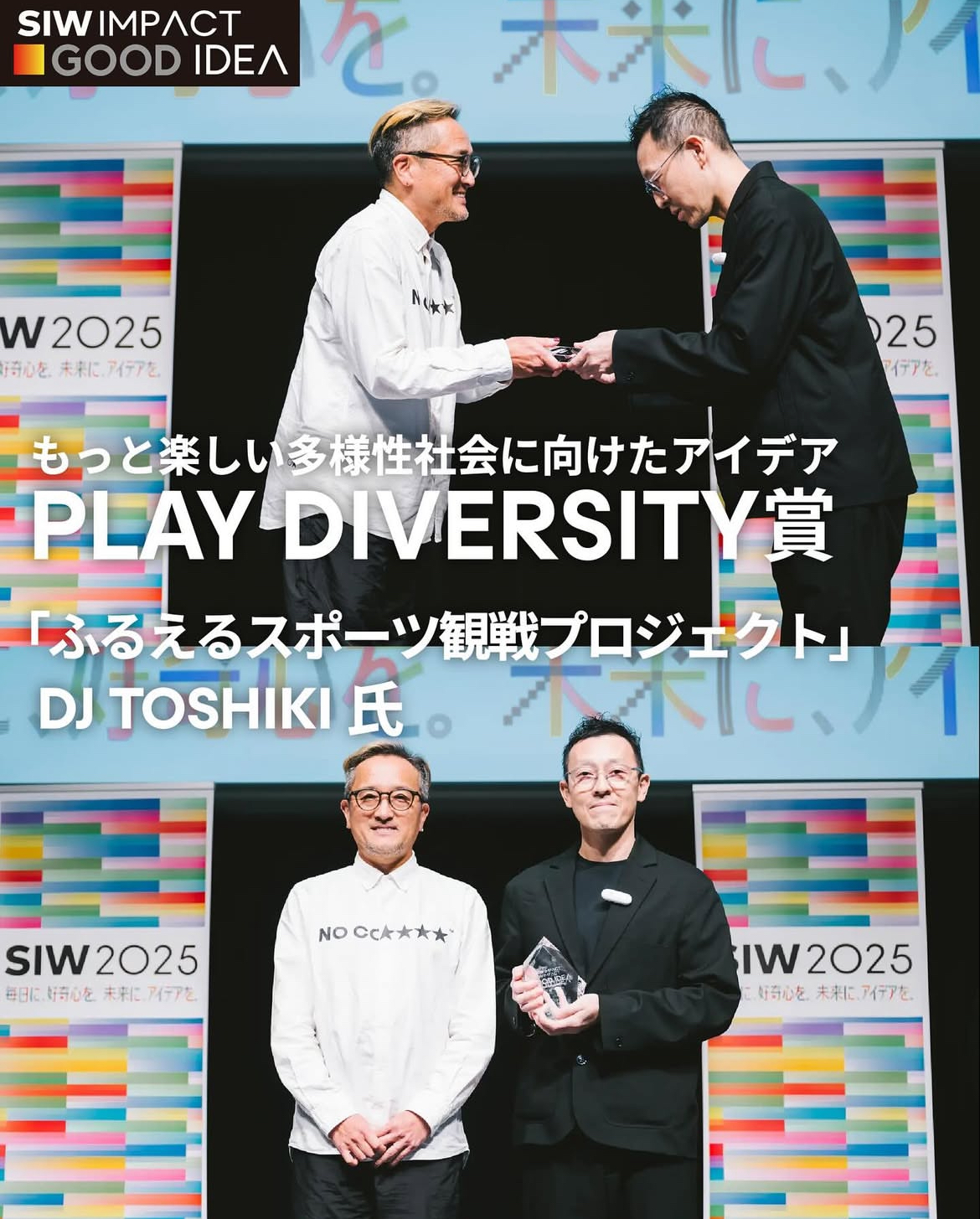 10月に行われた、一般社団法人渋谷未来デザインが主催する、「SOCIAL INNOVATION WEEK 2025」において、”より良い未来につながるアクションやアイデアをノミネートし表彰するアワード”「SIW IMPACT」のGOOD IDEA部門にて、弊団体が進める『ふるえるスポーツ観戦プロジェクト』が、PLAY DIVERSITY賞を受賞いたしました。